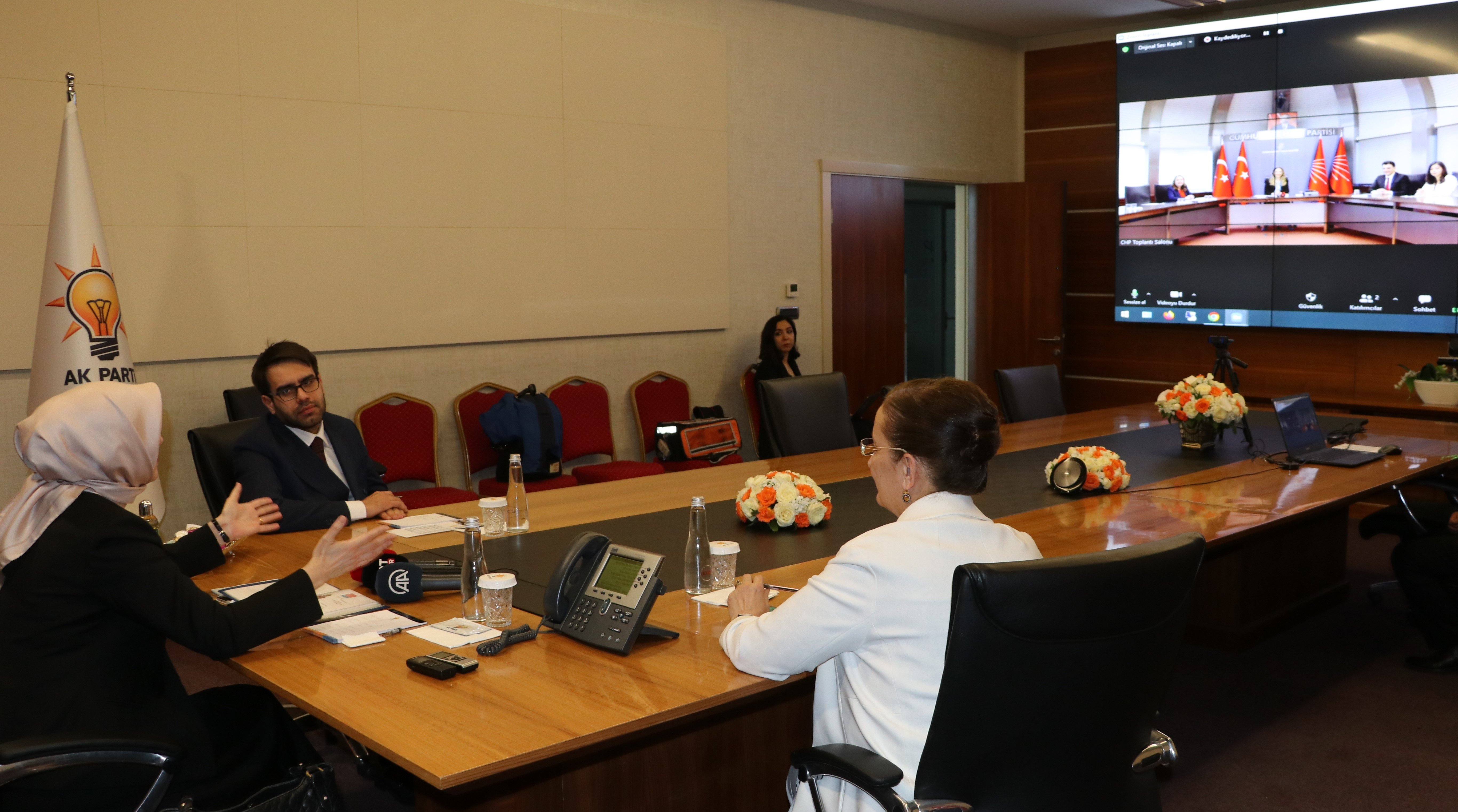 Heyet ilk olarak CHP Kadın Kolları Genel Başkanı Aylin Nazlıaka, İstanbul Milletvekili ve Parti Meclisi üyesi Zeynel Emre, Parti Meclis üyesi Semra Dinçer ile Gençlik Kolları MYK üyesi Canan Taşer ile videokonferans yöntemiyle bayramlaştı. AKP ve CHP heyetleri, görüşmede karşılıklı bayram tebriklerinde bulundu.