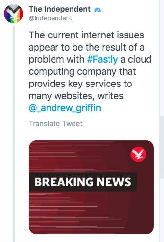 Independent teknoloji editörü Andrew Griffin, internet sitelerine erişimdeki sorunun Fastly isimli bulut bilişim hizmeti veren şirkette yaşanan kaynaklandığını söyledi.
