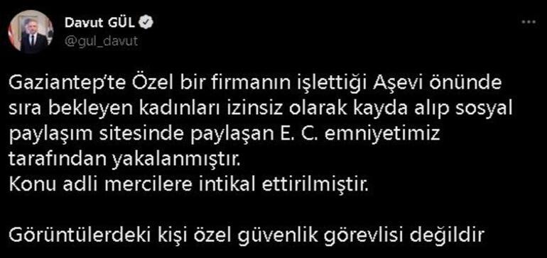 Gaziantep Valisi Davut Gül ise konu ile ilgili yaptığı açıklamada, “Gaziantep’te özel bir firmanın işlettiği aşevi önünde sıra bekleyen kadınları izinsiz olarak kayda alıp sosyal paylaşım sitesinde paylaşan E.C. emniyetimiz tarafından yakalanmıştır. Konu adli mercilere intikal ettirilmiştir. Görüntülerdeki kişi özel güvenlik görevlisi değildir” diye konuştu.