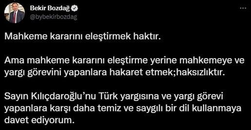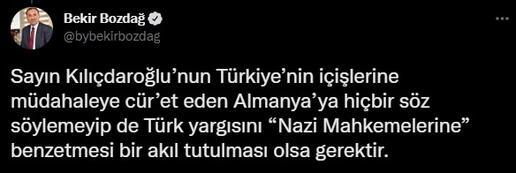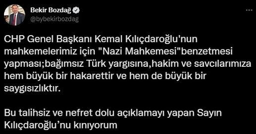 Bozdağ, “CHP Genel Başkanı Kemal Kılıçdaroğlu’nun mahkemelerimiz için ‘Nazi Mahkemesi’ benzetmesi yapması; bağımsız Türk yargısına, hakim ve savcılarımıza hem büyük bir hakarettir ve hem de büyük bir saygısızlıktır. Bu talihsiz ve nefret dolu açıklamayı yapan Sayın Kılıçdaroğlu’nu kınıyorum. Sayın Kılıçdaroğlu’nun Türkiye’nin içişlerine müdahaleye cüret eden Almanya’ya hiçbir söz söylemeyip de Türk yargısını ‘Nazi Mahkemeleri’ne benzetmesi bir akıl tutulması olsa gerektir. Mahkeme kararını eleştirmek haktır. Ama mahkeme kararını eleştirme yerine mahkemeye ve yargı görevini yapanlara hakaret etmek haksızlıktır. Sayın Kılıçdaroğlu’nu Türk yargısına ve yargı görevi yapanlara karşı daha temiz ve saygılı bir dil kullanmaya davet ediyorum” dedi.