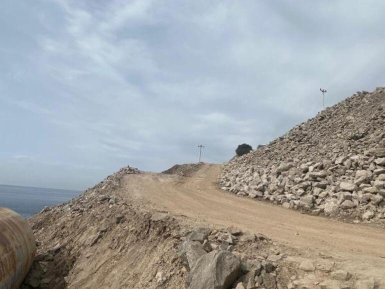 Gündoğan Küçükbük Mahallesi’nde salı günü deniz kenarındaki parselde yürütülen inşaat çalışmalarında, iş makineleri ve kamyonlarla deniz …