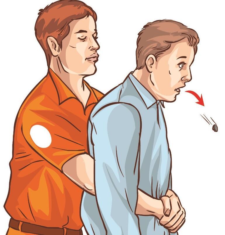 – Bir el yumruk yapılarak, başparmak çıkıntısı midenin üst kısmına, göğüs kemiği altına gelecek şekilde yerleştirilir. Diğer el ile yumruk yapılan el kavranır.