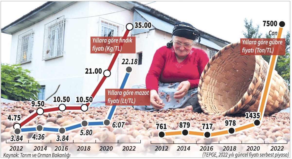 Geçen yıl 22.11 lira olan 1 kilo kabuklu fındıkla 14.5 kilo gübre alabilen çiftçinin, bu yıl aynı miktardaki gübreyi alabilmesi için TMO tarafından belirlenecek kabuklu fındık fiyatının 110 lira civarında olması gerekiyor.