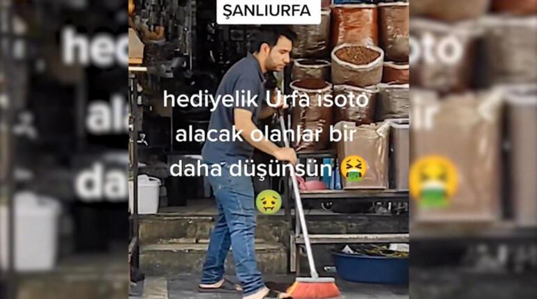 Şanlıurfa yöresine özgü ‘isot’ adıyla bilinen acı pul biberi satışı yapan bir esnaf, iddiaya göre yere dökülen biberleri fırçayla süpürerek …