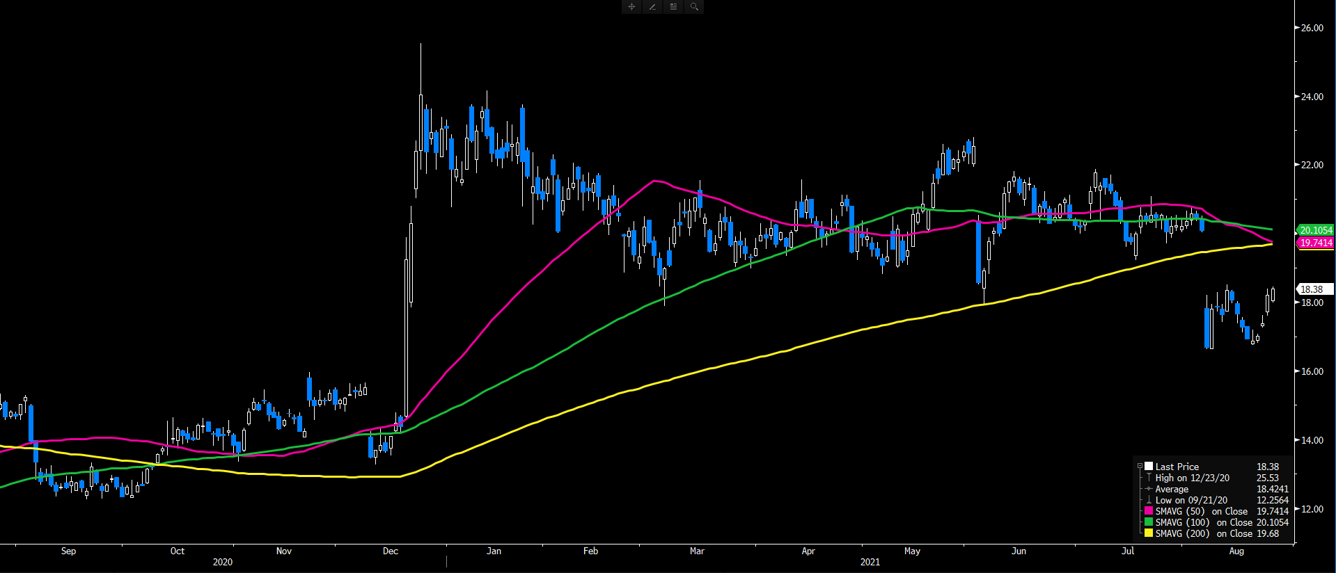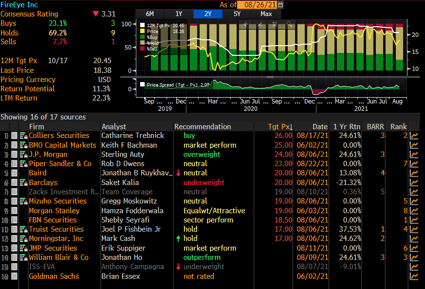 FIREEYE hisse senedi 6 – 9 ağustos 2021’de gördüğü 16.62 seviyesinde çift dip formasyonu oluşturarak, 18.00 seviyesi üzerinde kalma çabasını sürdürmektedir. Yukarı yönde 200 günlük ortalama (19.68) – 50 günlük ortalama (19.74) – 100 günlük ortalama (20.10) seviyeleri majör direnç olurken kırılması durumunda 22.00 seviyesi gündeme gelebilir. İlgili ortalamalar altında baskılanma sürecek olursa çift dip 16.62 tekrar takip edilebilir. Analistlerin 12 aylık dönem için hedef fiyatı $20.45 seviyesinde bulunurken, en yüksek hedef fiyat $26.00 seviyesi olarak Bloomberg terminalinde yer almaktadır. (Kaynak: Bloomberg)