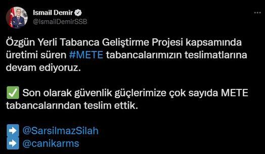 Savunma Sanayii Başkanı Demir, Twitter’daki hesabından yaptığı açıklamada, “Özgün Yerli Tabanca Geliştirme Projesi kapsamında üretimi süren METE tabancalarımızın teslimatlarına devam ediyoruz. Son olarak güvenlik güçlerimize çok sayıda METE tabancalarından teslim ettik” dedi.