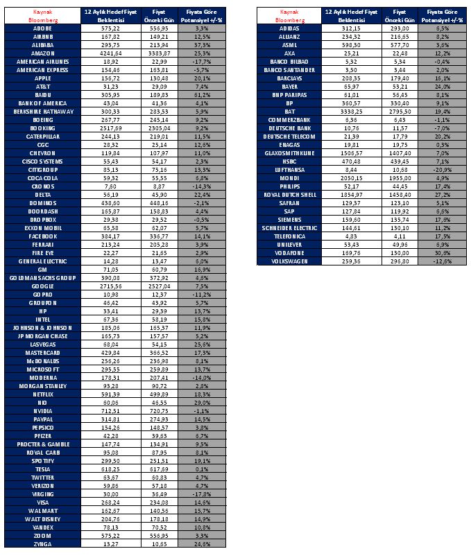***Tabloda pay senetlerinin Bloomberg terminalinden alınan maksat fiyatlar gösterilmiştir. Maksat fiyat ile evvelki gün kapanışı karşılaştırılarak aşağı yahut üst taraf % olarak belirtilmiştir. Kapanış fiyatı yahut gaye fiyat değiştikçe üst yahut aşağı potansiyel değişiklik gösterecektir. Kimi durumlarda gaye fiyat, cari fiyatın altında kalabilir. Belirtilen maksat fiyatlar katiyetle GCM Yatırım Araştırma hesaplaması yahut görüşü değildir. Paylaşım hedefi genel piyasa eğilimini belirtmek için yapılmış olup mutlaka al/sat/tut tavsiyesi değildir.