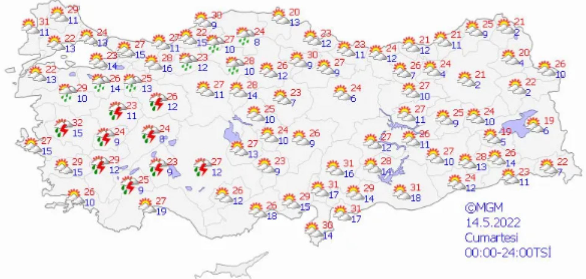 Meteoroloji Genel Müdürlüğü tarafından yapılan son değerlendirmelere göre: Marmara, Ege ve Batı Akdeniz ile Doğu Anadolu’nun güneydoğusunun parçalı bulutlu, öğleden sonra ve akşam saatlerinde Denizli ve Uşak çevreleri ile Manisa’nın doğusu, Afyonkarahisar ve Burdur’un batı ilçelerinin yerel olmak üzere sağanak ve gök gürültülü sağanak yağışlı, diğer yerlerin az bulutlu ve açık geçeceği tahmin ediliyor.