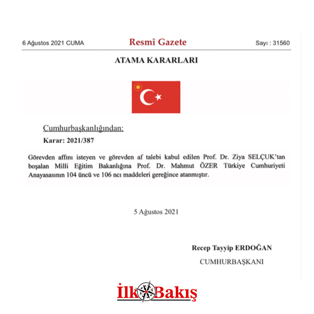 Resmî Gazete’de yayınlanan karara göre görevden affını isteyen Millî Eğitim Bakanı Prof. Dr. Ziya Selçuk’un yerine Bakan Yardımcısı Prof. Dr. Mahmut Özer atandı.