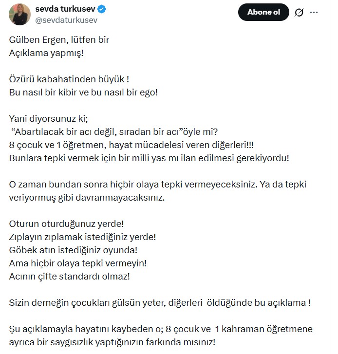 Türküsev, başka bir paylaşımda şu ifadeleri kullandı: “Berkin Elvan için “acımız var yasımız var” diyerek show programını iptal eden Gülben Ergen yaptığı açıklamada sekiz çocuk ve bir öğretmenin ölümüne verdiği cevapla ne kadar duyarsız olduğunu bir kez daha göstermiş oldu! Canının istediğine “yas”, istemediğini “yaş mı ilan edildi” Şifre standart vicdan!”