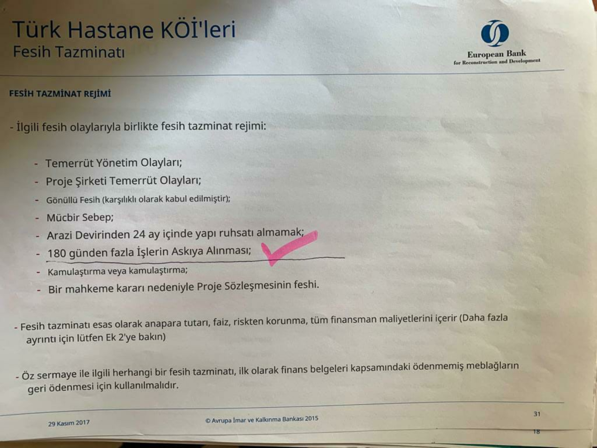 EBRD’de yer alan garantileri de sıralayan Kasap, “Laboratuvar, görüntüleme hizmetlerinde, sterilizasyon ve dezenfeksiyon hizmetlerinde, rehabilitasyon hizmetlerinde, atık yönetiminde, keten ve çamaşırhane hizmetlerinde ve yemek hizmetlerinde yüzde 70 garanti verilmiş. Yenilmeyen yemeğin parası bile verilecek” diye konuştu. Aynı zamanda EBRD’de yer alan bilgilerde 180 günden fazla sürede bitirilemeyen işlerin askıya alınacağı, yani fesih hakkının olduğunu aktaran Kasap, “Kocaeli, Kütahya, Gaziantep, Ankara Etlik ve İzmir Bayraklı şehir hastanelerinin inşaatları uzun yıllardır bitirilememesine rağmen bu haktan yararlanılmadı ve kamu zarara uğratıldı” ifadelerini kullandı.