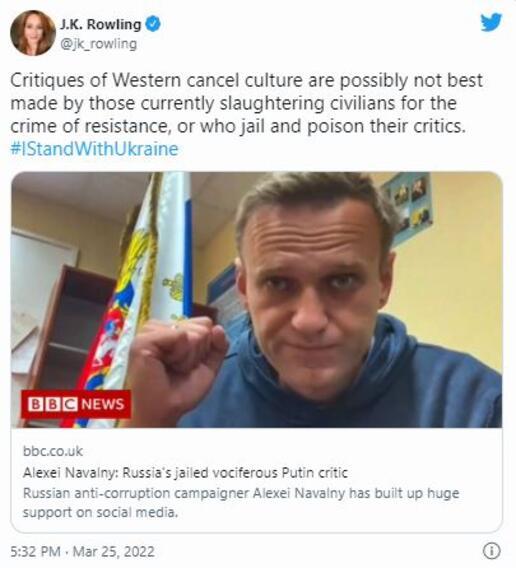 Rowling paylaştığı tweette yolsuzlukla mücadele kampanyası sonrası hapse atılan Rus muhalif lider Alexei Navalny hakkındaki bir bağlantıyı paylaştı ve #IStandWithUkraine etiketini kullandı.