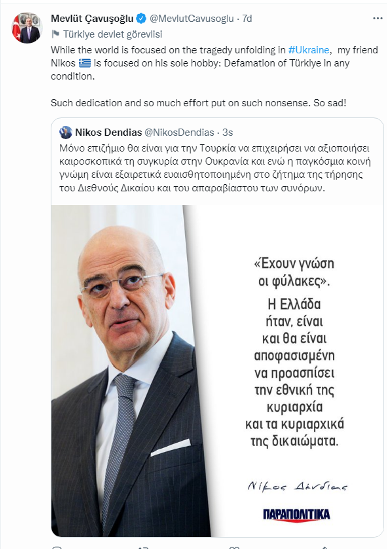 Çavuşoğlu paylaşımında şu ifadeye yer verdi: “Dünya Ukrayna’da yaşanan trajediye odaklanırken, arkadaşım Nikos tek hobisine odaklanmış durumda: Her koşulda Türkiye’yi karalamak.”