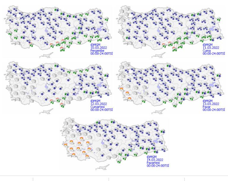 Güney Ege kıyıları dışında ülke iz genelinin aralıklı yağışlı geçeceği tahmin ediliyor. Kuzey Ege kıyıları, Güneydoğu Anadolu, Akdeniz kıyıları ile Malatya ve Elazığ çevrelerinde yağmur ve yer yer sağanak, diğer yerlerde karla karışık yağmur ve kar şeklinde olması beklenen yağışların İstanbul, Kocaeli, Sakarya, Kırklareli, Yalova, Bursa, Bilecik, Tekirdağ’ın doğusu, Balıkesir’in kuzeyi, Konya, Karaman, Aksaray, Kayseri, Nevşehir, Niğde, Antalya’nın doğusu, Adana, Kahramanmaraş, Osmaniye, Hatay, Muş, Bitlis, Şırnak, Van’ın güneyi, Hakkari, Adıyaman ve Siirt çevrelerinde kuvvetli olacağı tahmin ediliyor. Rüzgarın Marmara ve Ege ile Batı Akdeniz’in batısında kuzey ve kuzeydoğu yönlerden, Doğu Anadolu’nun doğusunda güneybatı yönlerden kuvvetli (40-60 km/sa) olarak eseceği tahmin ediliyor. Karadeniz’in iç ve yüksek kesimleri ile Doğu Anadolu’da yüksek kar örtüsüne sahip eğimli bölgelerde çığ riski bulunurken, sabah saatlerinde Trakya ile iç ve doğu kesimlerde buzlanma ve don olayı bekleniyor.