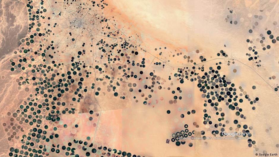 Suudi Arabistan çölüne uzaydan bakıldığında, yüzlerce yeşil çembergörülüyor. Her biri yaklaşık bir kilometre çapında olan bu çemberler, 1970’lerden bu yana çöldeki tarım arazilerinin genişlemesinin sembolü konumunda.