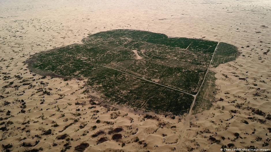 1988’de Pekin’in kuzeybatısındaki Kubuqi Çölü’ne bir tuz madeninin ulaşım yollarını çöl kumlarına karşı korumak amacıyla ağaçlar dikildi. Son yıllarda burası, dünyanın en başarılı yeniden yeşillendirme programlarından biri haline geldi.