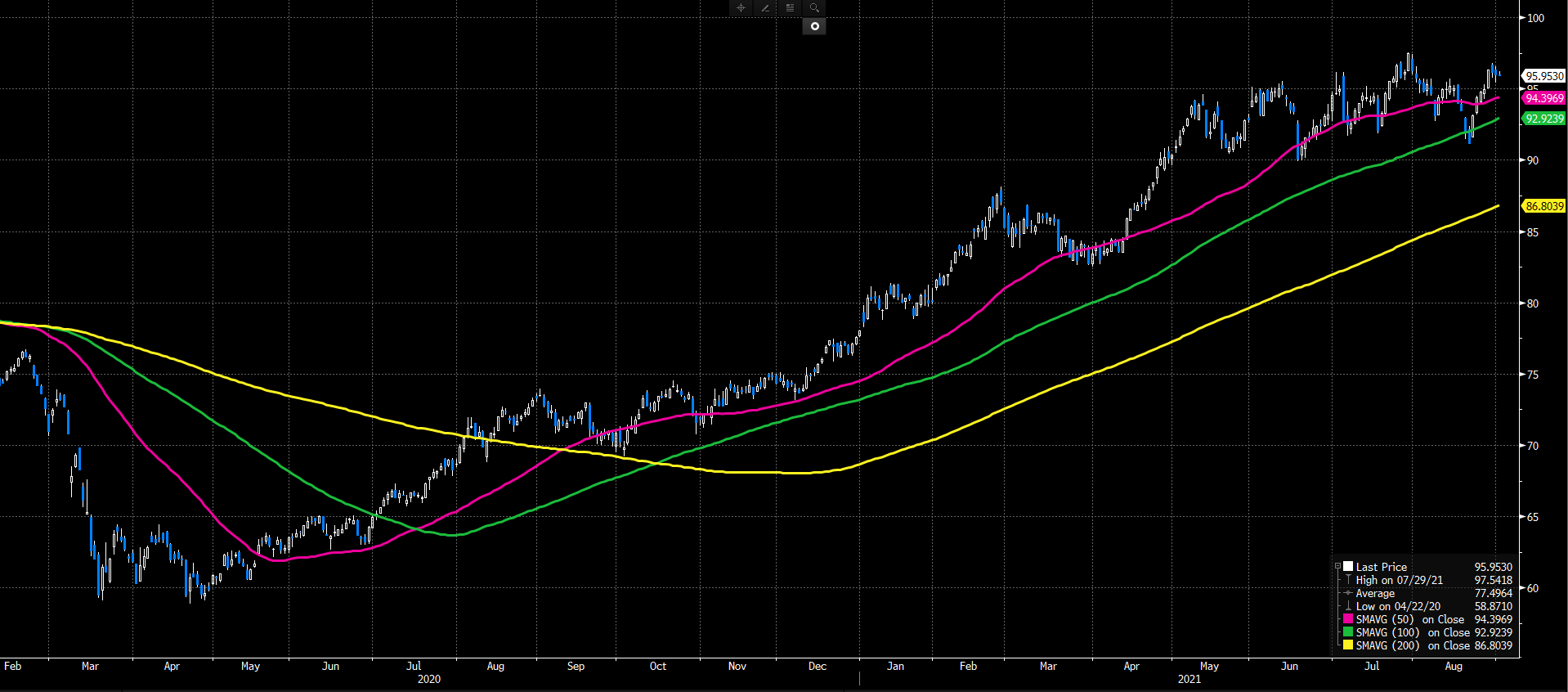 Bloomberg emtia endeksi Nisan 2020’de gördüğü 58.87 düşük seviyesini gördükten sonra güçlü trendle Temmuz 2021’de 97.54 seviyesini görmüştür. Bu seviyenin üzeri için farklı dinamikler gerekmektedir.