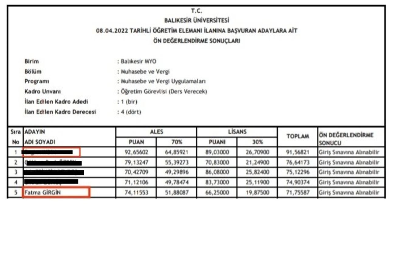 Sözcü’den Halil Ataş’ın haberine göre, üniversite, 8 Nisan’da Balıkesir Meslek Yüksek Okulu Muhasebe ve Vergi Bölümü’ne alacağı öğretim görevlisi için sınav açtı. Ön değerlendirme sınavına 17 kişi girdi, 6 kişi kazandı.