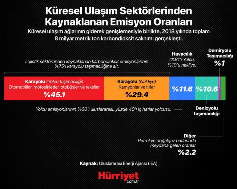 Hükûmetlerarası Küresel Isınma Paneli’nde (IPCC) ele alınan, ulaşım sektörünün doğaya bıraktığı karbondioksit oranları incelendiğinde, kara, hava ve deniz yolu ulaşımının küresel krize olan etkilerinin yüzde 25’i aştığı görülüyor.